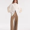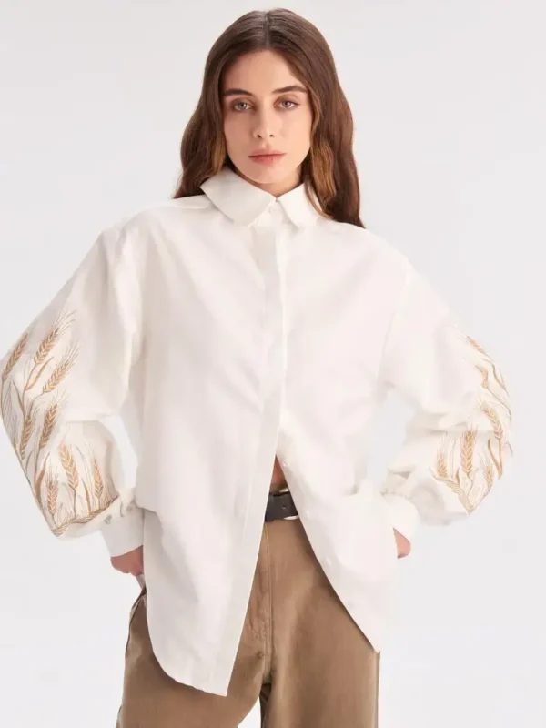Crafted in Ukraine using traditional hand-embroidery techniques, this blouse features beautifully stitched golden wheat motifs along the voluminous sleeves—symbolic, artisanal, and unmistakably elegant. Made from soft, breathable cotton, this crisp white button-down blends effortless sophistication with meaningful craftsmanship.