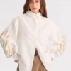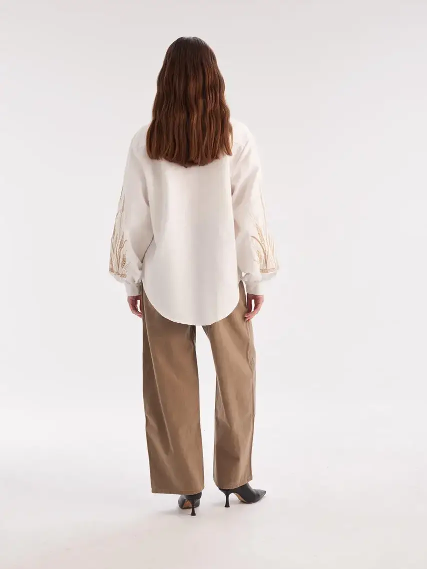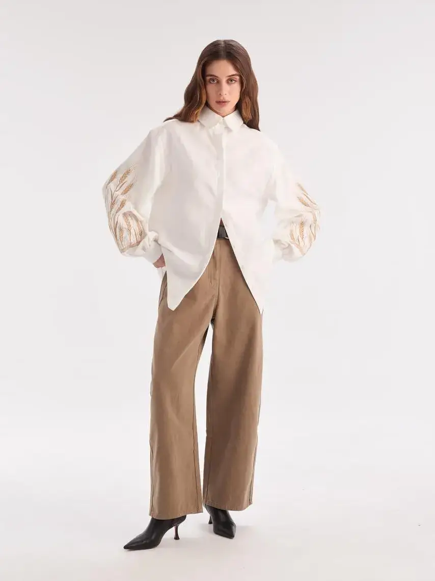 Crafted in Ukraine using traditional hand-embroidery techniques, this blouse features beautifully stitched golden wheat motifs along the voluminous sleeves—symbolic, artisanal, and unmistakably elegant. Made from soft, breathable cotton, this crisp white button-down blends effortless sophistication with meaningful craftsmanship.