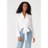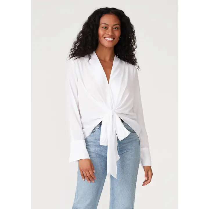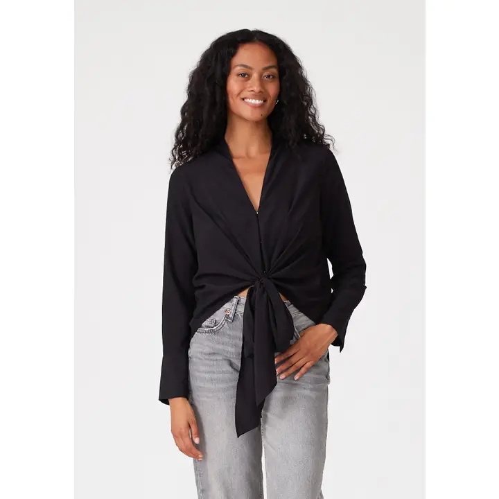 Tie front blouse with a v-neckline and long sleeves. Features snap button front, double button cuff closure, and a high low hem.