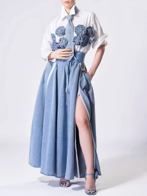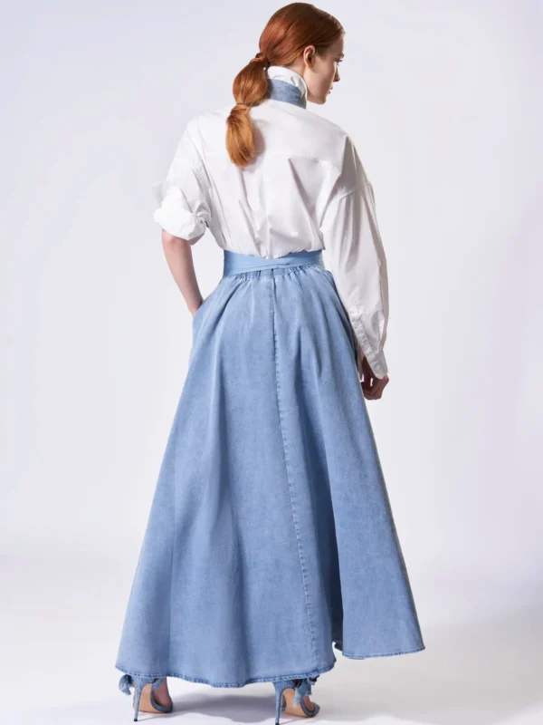 This premium Italian mid-weight denim maxi skirt has dual front zippers that let you adjust the slit as high or as low as you like on each side. The two zippers create movement, versatility, and a touch of asymmetry for a high-fashion look in a casual denim fabric. Finished with an elastic waistband and adjustable tie for a customizable, comfortable fit. A closet staple for the fashion-forward woman who loves effortless style.