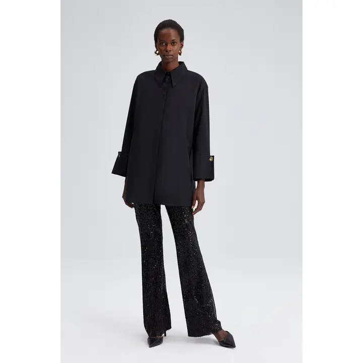 Introducing our exquisite long-sleeve blouse, designed with wide cuffs that exude timeless elegance. The flowing silhouette drapes beautifully, creating a flattering shape that complements any figure. Crafted from a soft, breathable fabric, this piece is perfect for both casual outings and sophisticated gatherings. The wide cuffs add a touch of drama, allowing you to effortlessly elevate your look. Pair it with tailored trousers for the office or with your favorite jeans for a chic weekend ensemble. Embrace the art of refined style with this versatile staple.