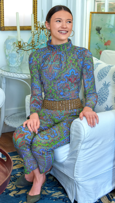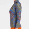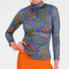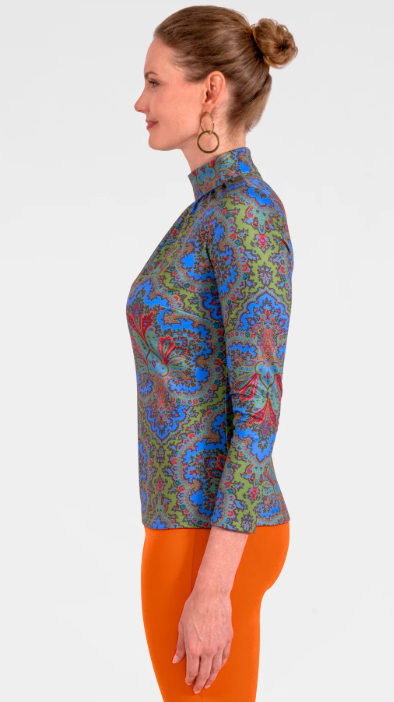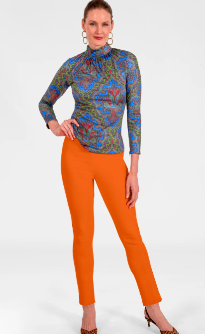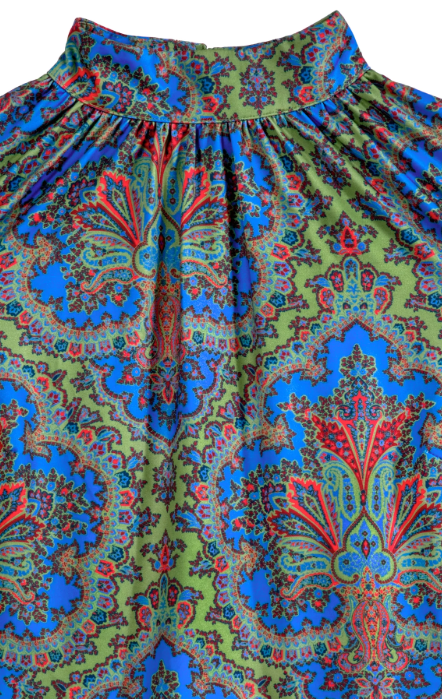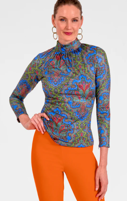 High-neck printed top with vibrant blue and red detailing. Buttery soft stretch fabric, elegant gathered neckline, and a slimming fit that’s ideal for work, dinner, or out and about with the girls!